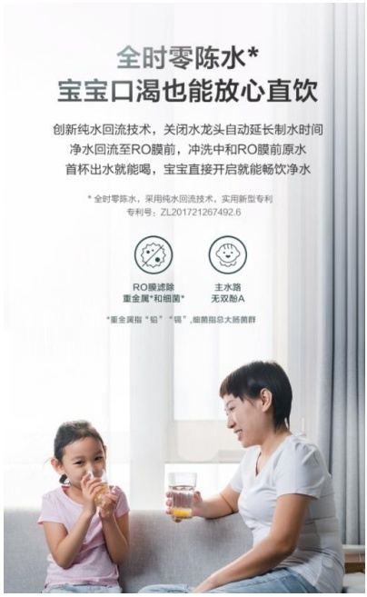 针对传统净水器“第一杯水TDS值高,不能直接饮用”的行业痛点,美的白泽1200G净水机创新采用纯水回流技术,当关闭水龙头时,会自动延长制水时间,使得净水回流至RO膜前,冲洗中和RO膜前原水,开启即可畅饮净水,极大改善了用户饮水体验。真正实现了母婴级的全时0陈水,纯物理过滤,0阻垢剂、无化学添加,确保用户全时用水,安全干净。对于肠胃敏感,身体抵抗力较差的母婴群体来说,“每一杯水都安全”能够为他们提供更健康放心的用水保障。