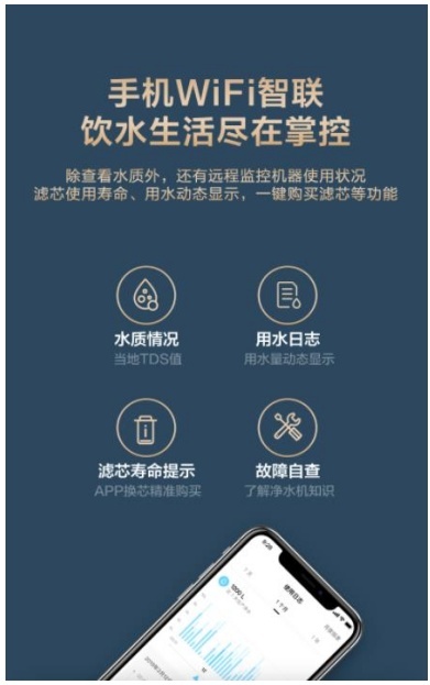 美的白泽1200G净水机支持手机WIFI智联,不仅能实时查看水质,还能进行远程监控机器使用状况、滤芯使用寿命、用水动态显示,一键购买滤芯等功能,让用户轻松掌控饮水生活。即便用户不在家也通过手机app获取净水机使用状态,让全家尽享健康安全饮水质感生活。