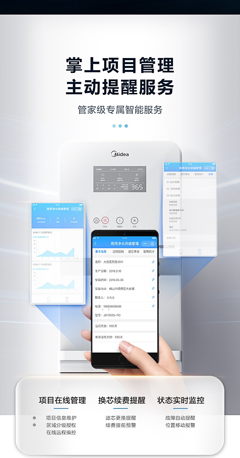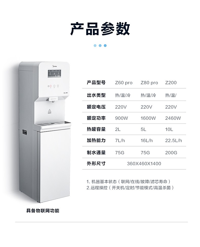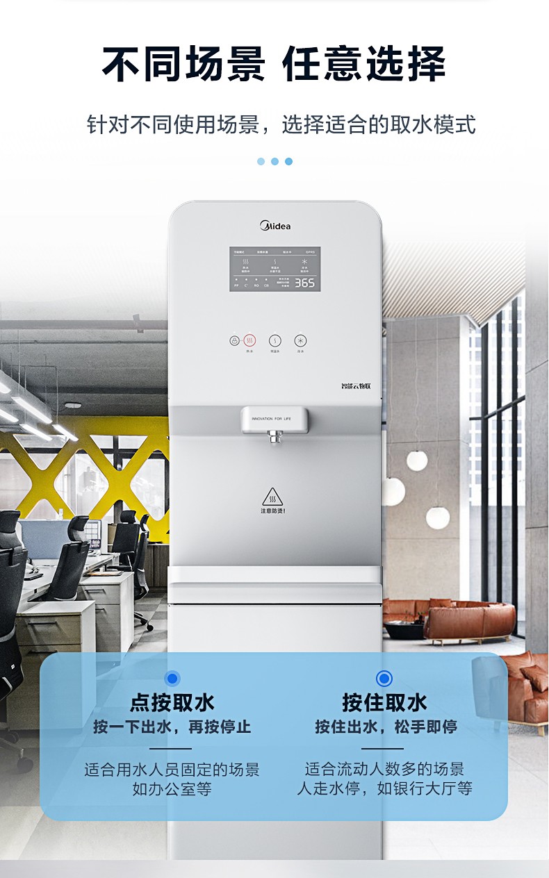 美的 Midea 【JD1851S-RO】Z80Pro版共享净水租赁 在线咨询 立即购买 美的美的 Midea 【JD1851S-RO】Z80Pro版共享净水租赁 自动款 技术参数 品牌 美的 电源电压 220V 额定功率 1600W 出口 开水、常温水、冰水 尺寸 380×360×1315mm 使用人数 30人左右 应用范围 办公室 产品详情
