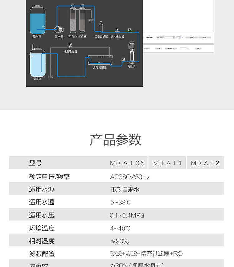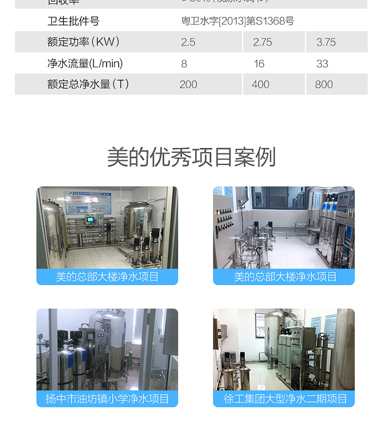美的Midea-【MD-A-I-2】2吨商用净水主机 在线咨询 立即购买 美的美的Midea-【MD-A-I-2】2吨商用净水主机 自动款 技术参数 品牌 美的 电源电压 380V 额定功率 2.5kw 出口 常温水、可直饮 尺寸 1950×800×1920mm 使用人数 1500-2500人 应用范围 大型工厂 车站专用设备间 产品详情