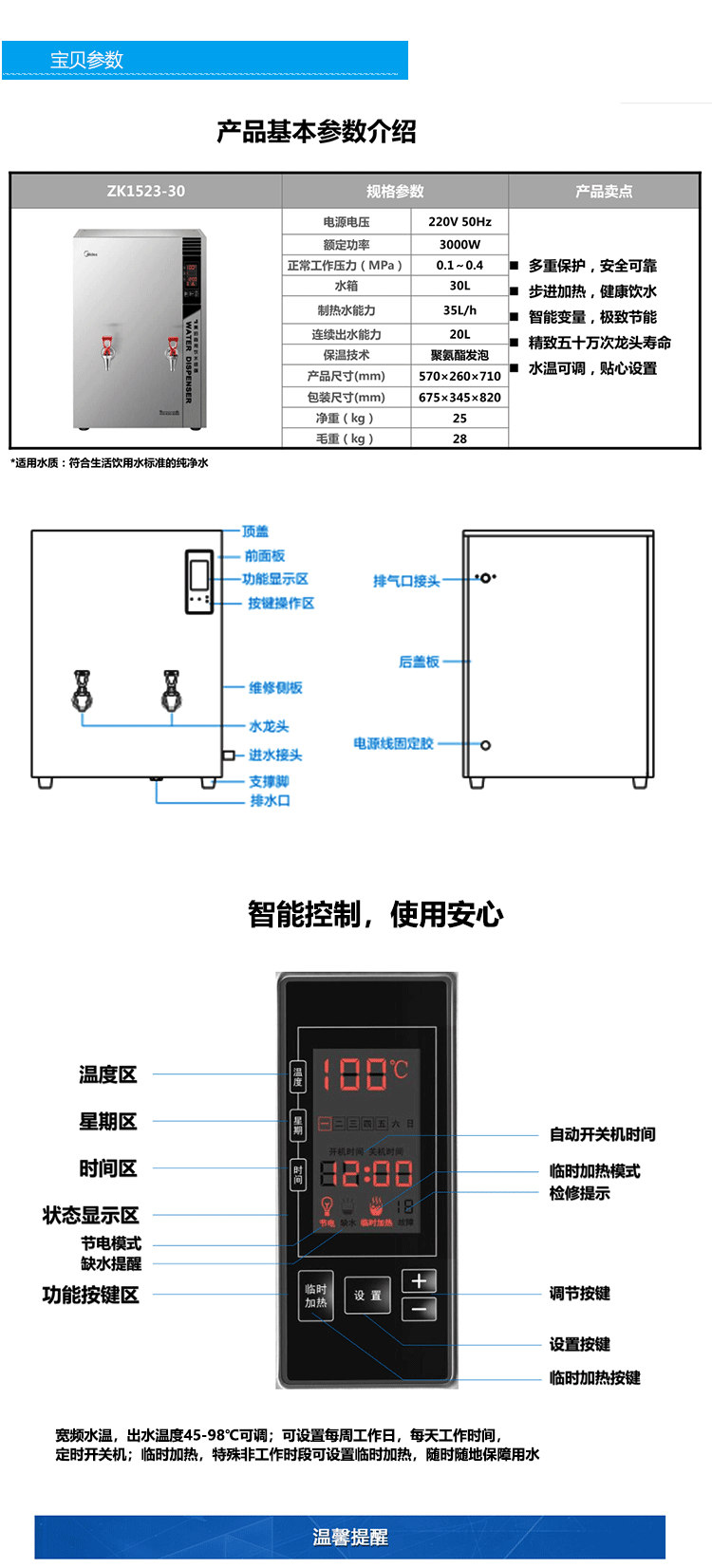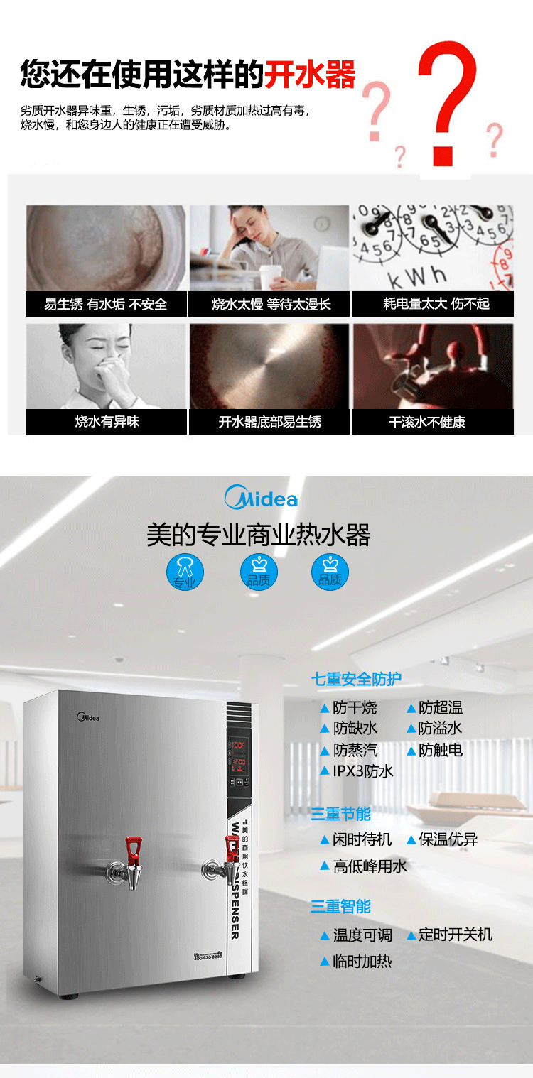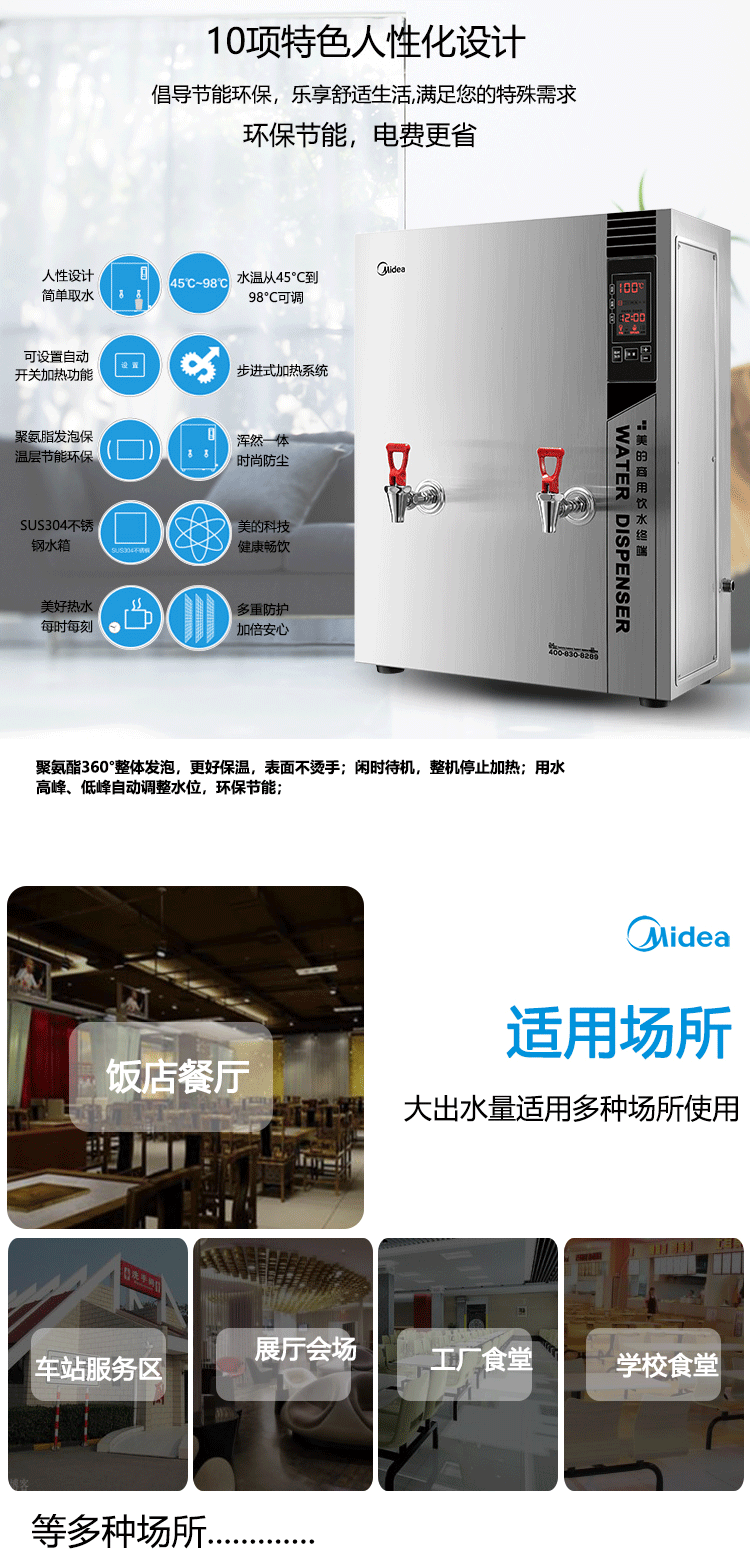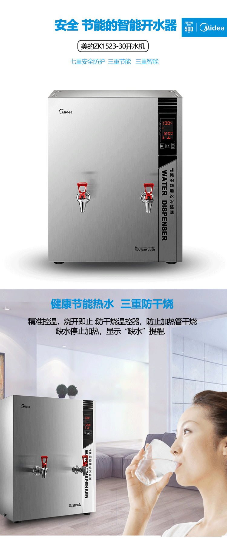 美的(Midea)商用净水器企业采购 ZK1523-30 在线咨询 立即购买 美的美的(Midea)商用净水器企业采购 ZK1523-30 自动款 技术参数 品牌 美的 电源电压 220V 额定功率 3000W 出口 两开水 尺寸 长580mmX宽267mmX高728mm 使用人数 70人以上 应用范围 工厂 车站 机场 产品详情
