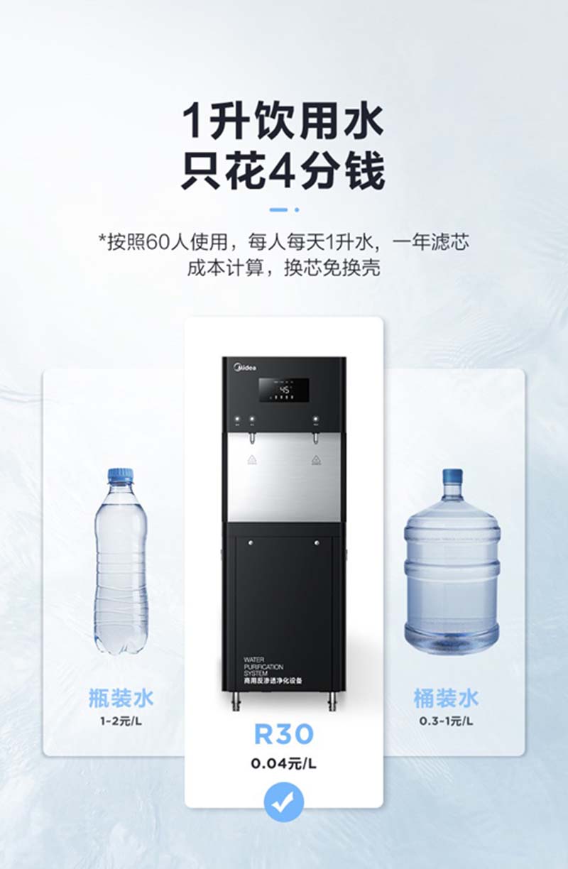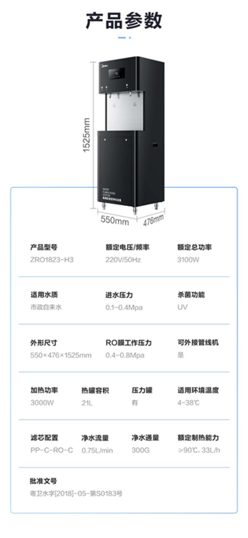 美的 Midea ZRO1823-H3(R30)商用直饮一体机 在线咨询 立即购买 美的美的 Midea ZRO1823-H3(R30)商用直饮一体机 自动款 技术参数 品牌 美的 电源电压 220V/50HZ 额定功率 3KW 出口 一开一常温 尺寸 550*1525*476mm 使用人数 80-100人 应用范围 工厂、餐饮、医院、单位、车站等公共场所 产品详情