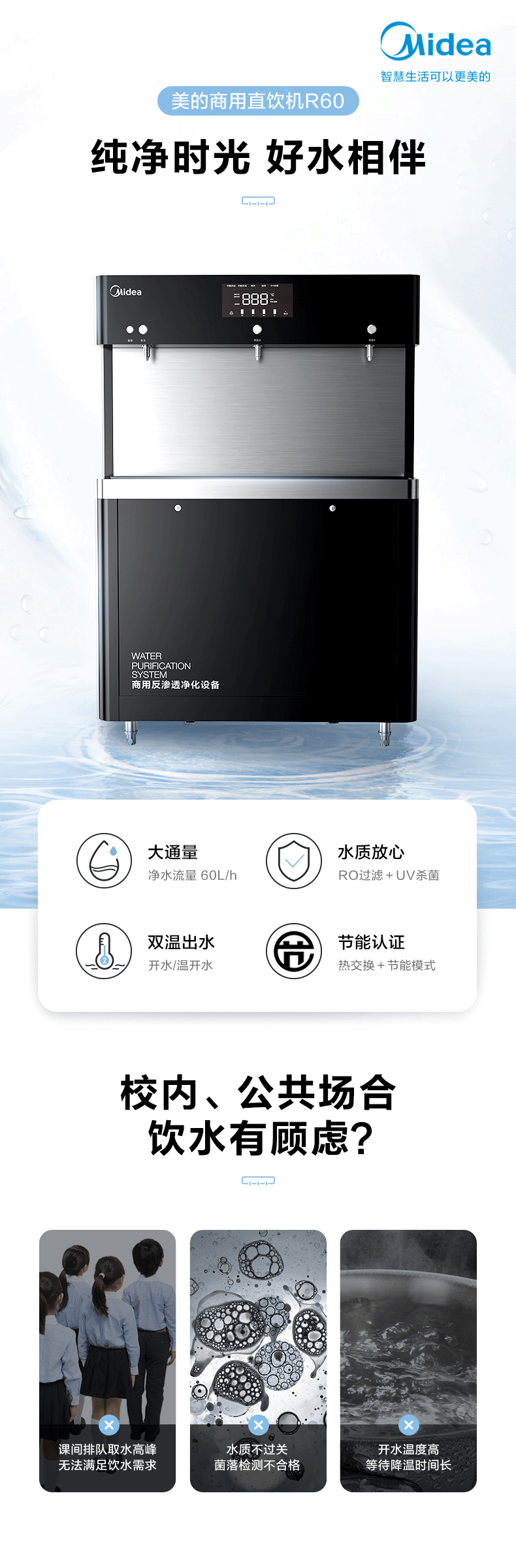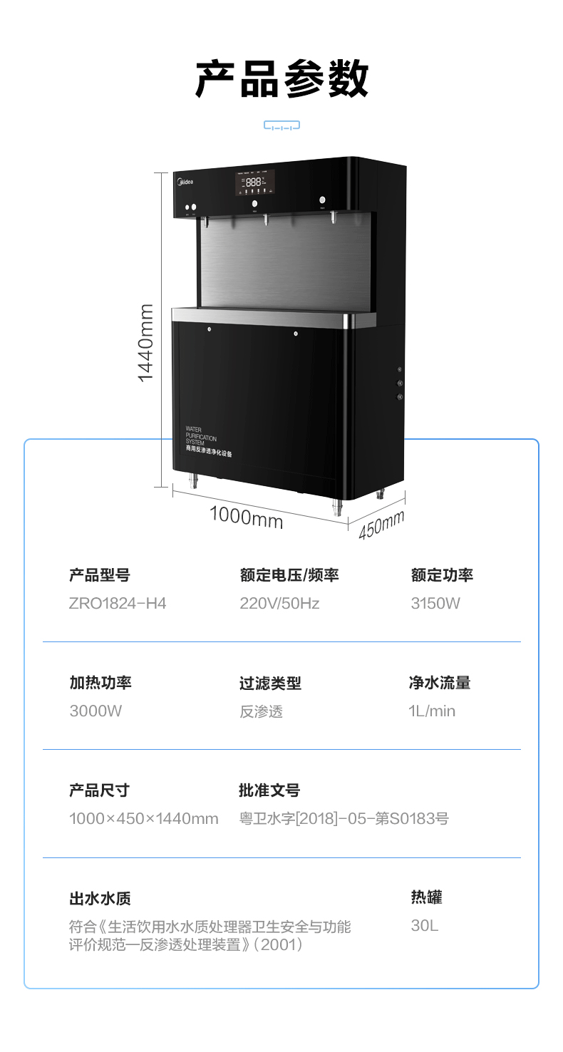美的 Midea RO款 ZRO1824-H4(R60) 在线咨询 立即购买 美的美的 Midea RO款 ZRO1824-H4(R60) 自动款 技术参数 品牌 美的 电源电压 380VAC 额定功率 3150W 出口 一开两温 尺寸 长100mmX宽450mmX高1440mm 使用人数 50-150人 应用范围 车间、工厂、医院、学校、办公室、企事业单位. 产品详情